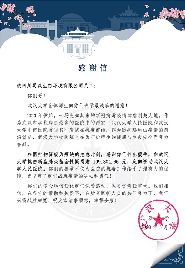 善款捐赠后,我司于2020年3月6日收到来自武汉大学全体师生的感谢信。