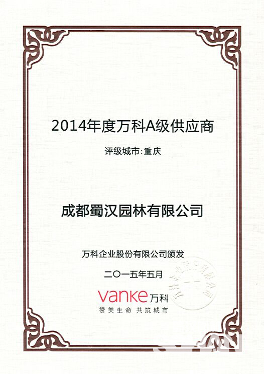我公司荣获“2014年度万科A级供应商”,在重庆一地获此荣誉的仅有三家。根据万科《招投标管理办法》,对于A级供应商有优先谈判权、优质优价系数等奖励政策。对于入选的供应商来说,是鼓励更是鞭策。