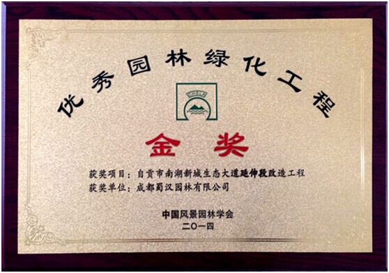 11月22日,2014年度中国风景园林学会“优秀园林绿化工程奖”颁奖典礼在福建漳州隆重举行,由我司承建的“自贡市南湖新城生态大道延伸段改造工程”荣获优秀园林绿化工程奖“金奖”。