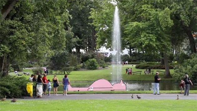 这是一个八米左右长的粉红色卡通平面景观雕塑,漂浮在池塘之上,好似浴后吐水玩耍,但却营造出轻松愉快的喷泉效果。