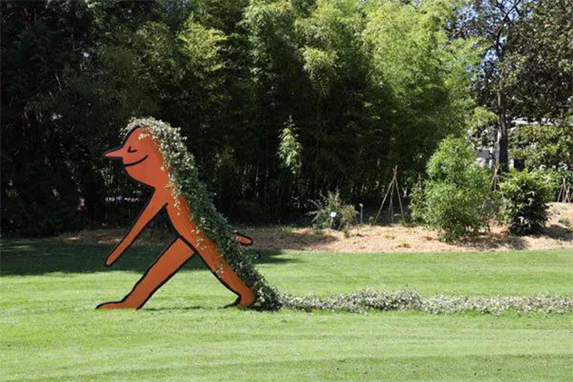 这是一个红色卡通平面景观雕塑,拖着由常春藤制成的长长“裙摆”,在园区内随意走动,搞笑诙谐又与周围环境相融合。