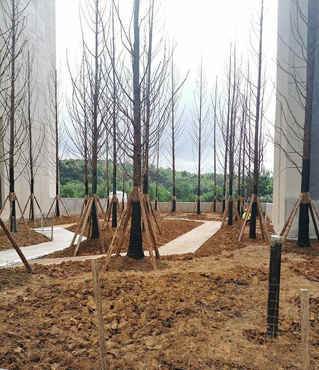 本次测评内容主要包括:混凝土的宽度、质量和观感;墙体垂直度、石材顺直度和材料厚度以及乔木树形等。