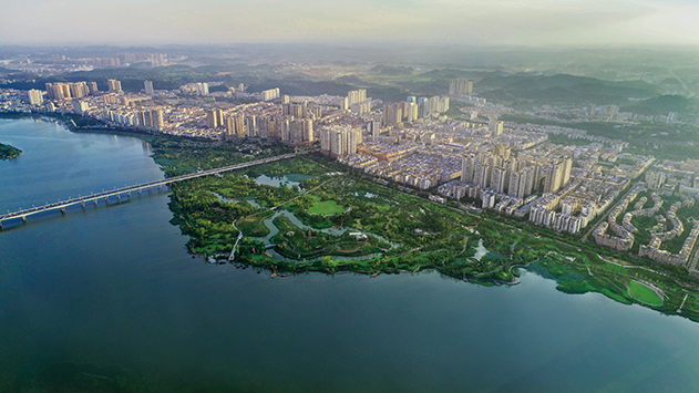 该项目位于遂宁市船山区,由绿化、景墙、广场、自然水体、停车场、园路、景观亭、栈道和特色跌水等部分组成,项目总面积约为60万㎡,其中内湖水体约8.9万㎡,绿地面积约43万㎡,共计使用景石约7500吨、大中乔木5400棵、花乔4100株、球灌6100株、地被草皮41万㎡。