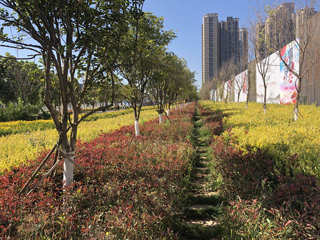 由于该项目位于昆明滇池国际会展中心正对面,围挡前有大面积的市政绿化工程,导致施工围挡拆除及重新安装、电线杆拆除、市政绿化工程移除进度缓慢的问题,且邻近昆明的雨季,水体开挖及回填面积太大,造成材料堆放地狭窄、施工材料到场困难的问题。