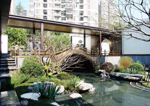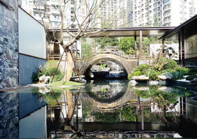 由我司承建的该项目于2017年8月20日进场施工至2017年10月31号完工,历时两个多月,该项目景观总面积为6045平方米;主要包括主入口长廊、无边际水域、小水体、拱桥水景、对景亭等,点睛、孤植、群植的乔木,体现不同节点不同景观要求,灌木以精致为主,以营造典雅、时尚、高端、精品,又具有中国特色风情的景观效果。