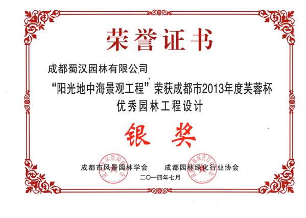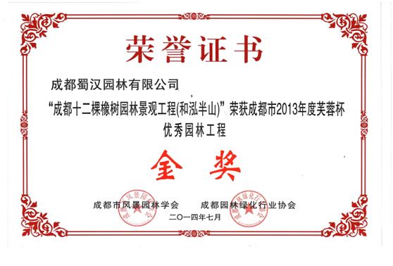 2014年7月17日上午,在由成都市风景园林学会、成都园林绿化行业协会联合举行的颁奖会上,我公司承建的成都十二棵橡树园林景观工程(和泓半山)项目荣获成都市2013年度“芙蓉杯”优秀园林工程金奖、 阳光地中海景观工程荣获成都市2013年度“芙蓉杯”优秀园林工程设计银奖。