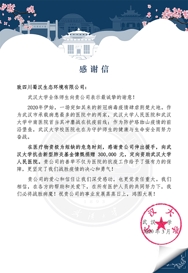 善款捐赠后,我司于2020年3月6日收到来自武汉大学全体师生的感谢信。